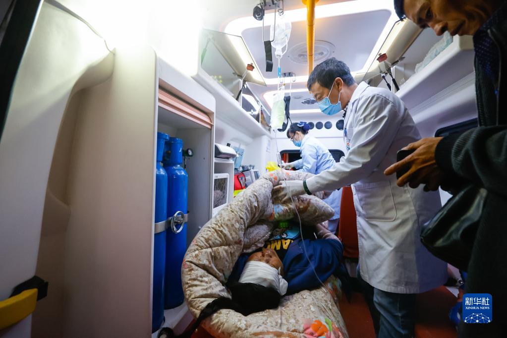 9月5日晚,在四川甘孜州瀘定縣磨西鎮(zhèn)的受災(zāi)群眾臨時(shí)安置點(diǎn),人們轉(zhuǎn)運(yùn)受傷群眾。新華社 沈伯韓 攝