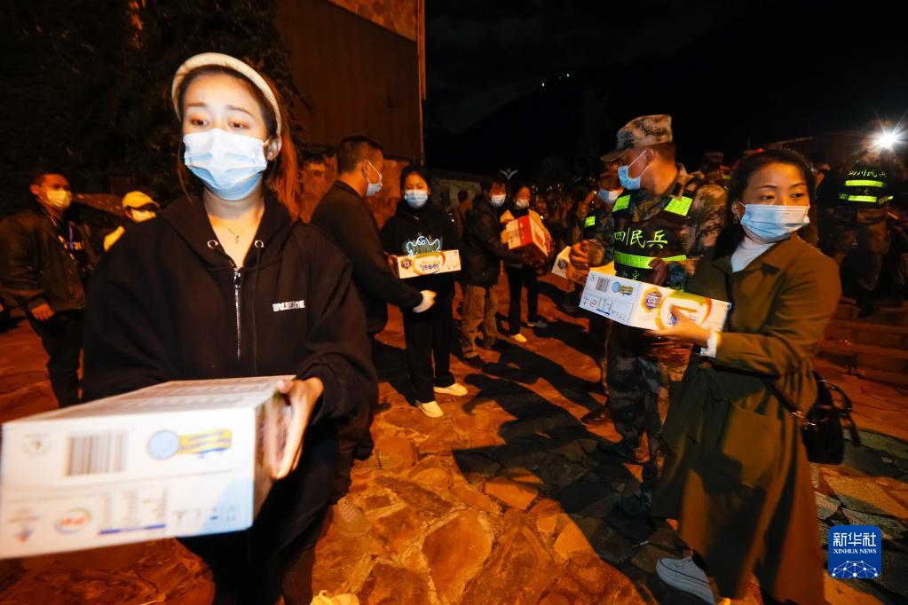 9月5日晚,在四川甘孜州瀘定縣磨西鎮(zhèn)的受災(zāi)群眾臨時(shí)安置點(diǎn),人們在傳遞救災(zāi)物資。新華社 沈伯韓 攝