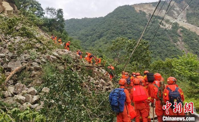 救援人員正在通過地震受損的山體路段。四川森林消防供圖