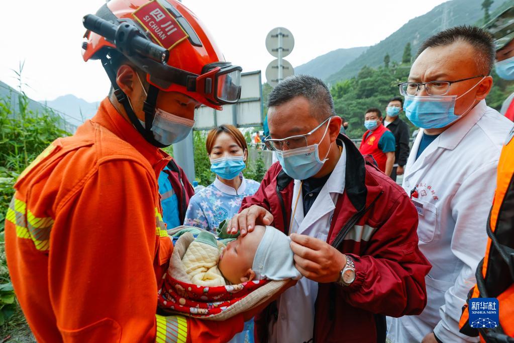 9月6日,阿壩森林消防支隊(duì)汶川大隊(duì)隊(duì)員張自立抱著一名從瀘定縣得妥鎮(zhèn)灣東村疏散出來的2個月大的嬰兒。新華社記者 沈伯韓 攝