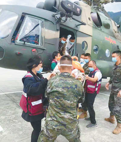 9月6日,在四川省瀘定縣瀘橋鎮(zhèn),四川省人民醫(yī)院赴瀘定醫(yī)療隊醫(yī)務(wù)人員正接診直升機轉(zhuǎn)運出來的傷員。王明峰 蘭昌文 攝