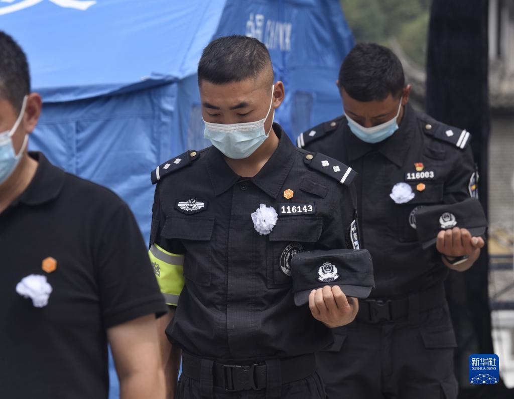 9月12日,在瀘定縣磨西鎮(zhèn),參加悼念活動的人員為遇難同胞默哀。 新華社記者 劉坤 攝