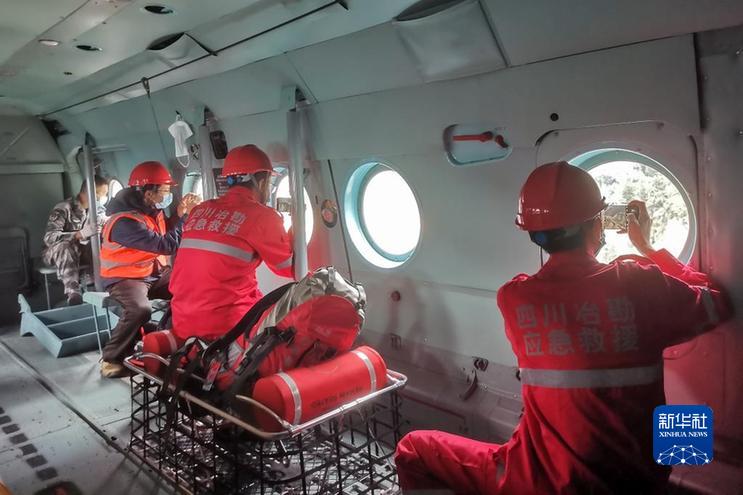 9月7日,四川省冶勘設(shè)計集團(tuán)有限公司的調(diào)查隊員在前往海螺溝景區(qū)的直升機(jī)上拍攝。新華社發(fā)(四川省冶勘設(shè)計集團(tuán)有限公司供圖)