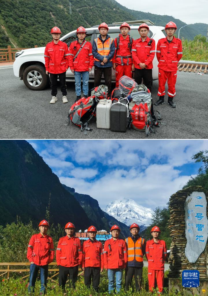 這是一張拼版照片,上圖為:9月7日,四川省冶勘設(shè)計集團(tuán)有限公司的6名調(diào)查隊員在搭乘直升機(jī)去往海螺溝前拍攝的合影(新華社記者沈伯韓攝);下圖為:9月10日,6名調(diào)查隊員在海螺溝景區(qū)一號營地拍攝的合影(四川省冶勘設(shè)計集團(tuán)有限公司供圖)。新華社發(fā)