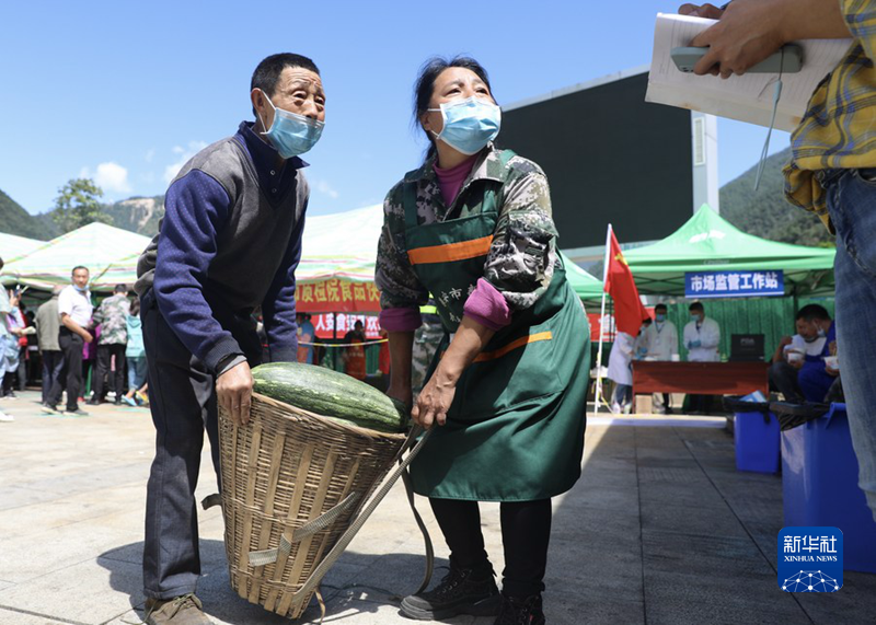 9月10日,在四川省石棉縣王崗坪鄉(xiāng)安置點內,謝欽明(左)為安置點送來南瓜。新華社記者 劉瓊 攝