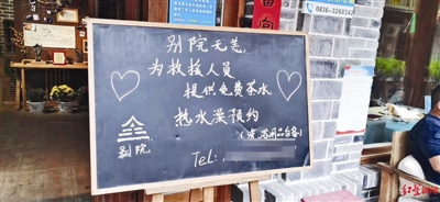 “古道別院”工作人員唐莎告訴記者,地震發(fā)生后,民宿就把客房提供給了救援人員住宿,也提供免費(fèi)茶水、咖啡,同時(shí)給救援人員和當(dāng)?shù)鼐用裉峁┫丛璧牡胤健?/p>