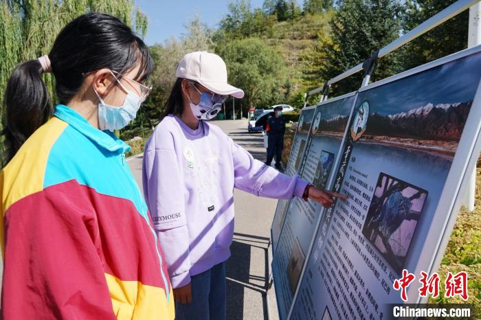 圖為青海野生動(dòng)物救護(hù)繁育中心副主任通過展板向?qū)W生介紹兔猻。馬銘言 攝