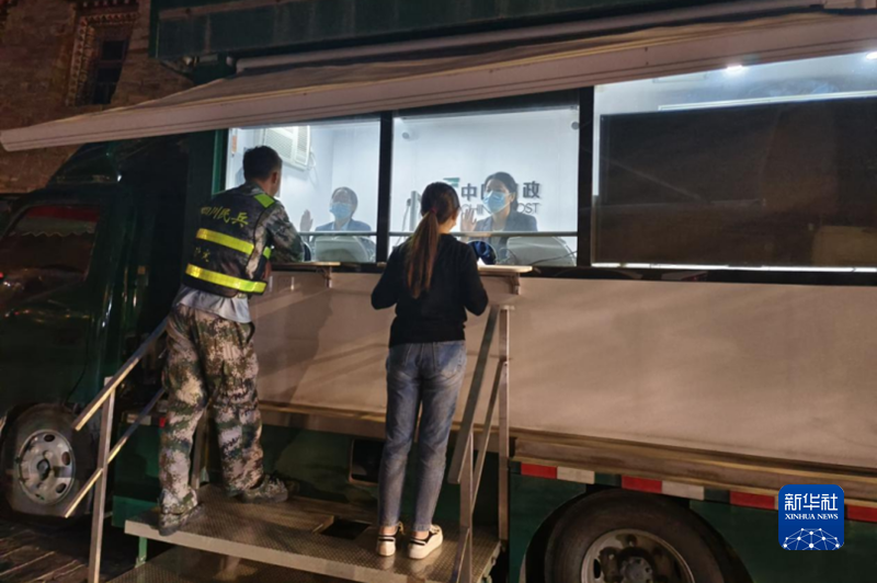 地震后第二天,郵政流動(dòng)服務(wù)車(chē)駛進(jìn)震中磨西鎮(zhèn)服務(wù)群眾。(四川郵政供圖)