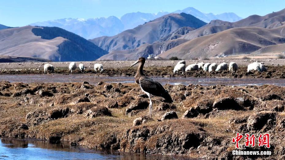 高原深秋,在祁連山國(guó)家公園青海片區(qū)的祁連縣阿柔鄉(xiāng)的一片沼澤地,攝影師拍到了一只成年黑鸛。畫(huà)面中,黑鸛在祁連縣阿柔鄉(xiāng)的一片沼澤地里覓食休憩,時(shí)而在羊群牛群中飛翔穿梭,仿佛在幫牧人“放牧”。包雷 攝