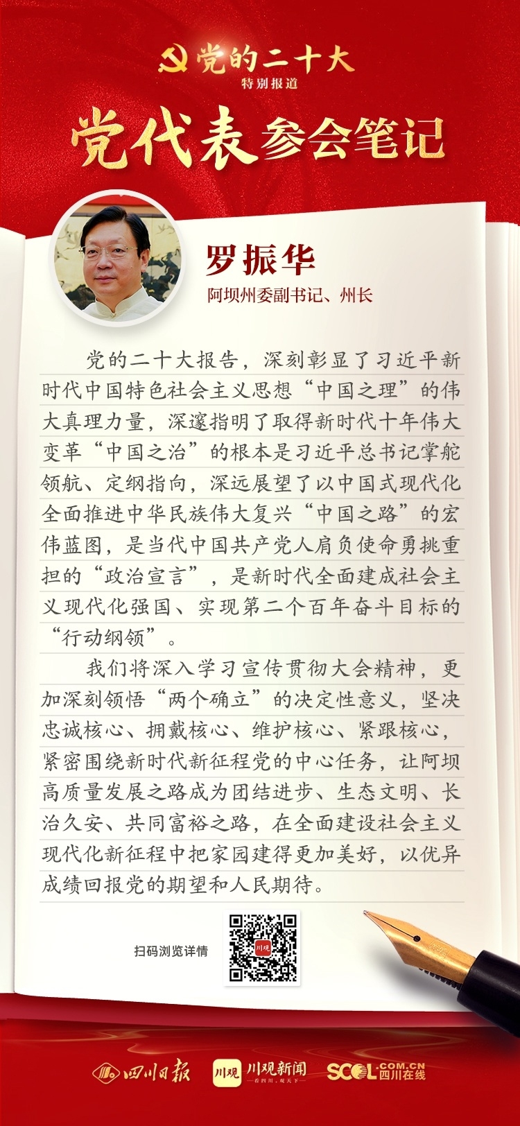 出席盛會(huì),來(lái)自四川的黨代表深感使命光榮、責(zé)任重大,大家認(rèn)真履職,結(jié)合報(bào)告談?wù)J識(shí)、談體會(huì)、談打算。川觀新聞特此推出“黨代表參會(huì)筆記”欄目,分享黨代表們的參會(huì)心得,敬請(qǐng)垂注。