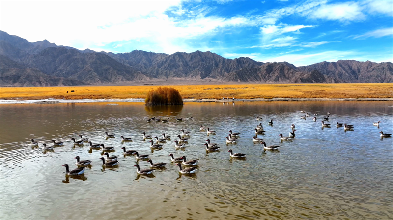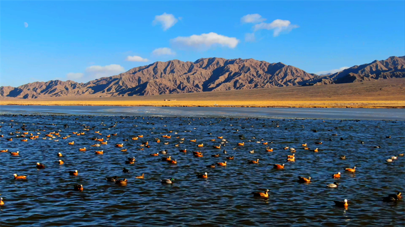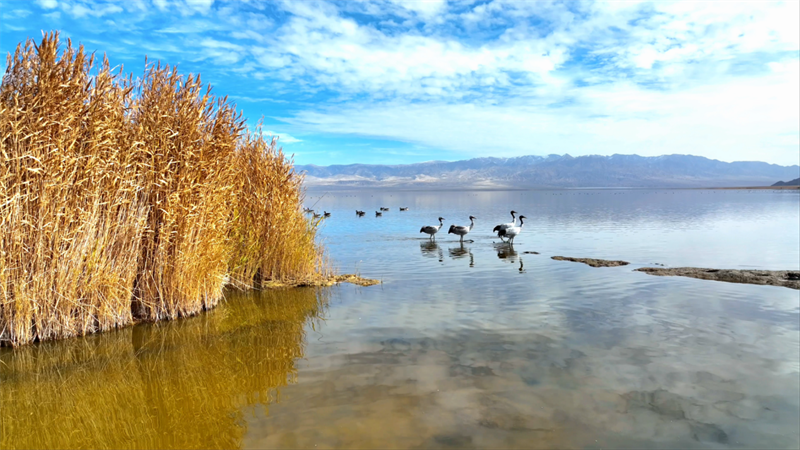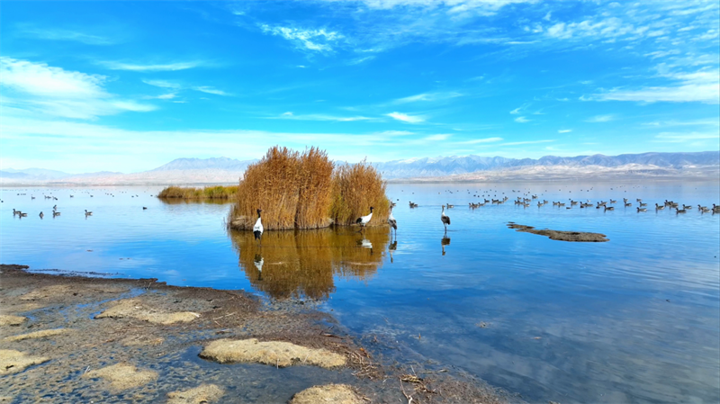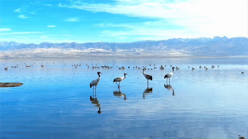 初冬時節(jié),在青海省海西蒙古族藏族自治州烏蘭縣都蘭湖國家濕地公園內(nèi),四只國家一級保護(hù)動物黑頸鶴,踏著黑色細(xì)長的腿在湖中閑庭信步,與斑頭雁、赤麻鴨一起嬉戲覓食,盡顯柴達(dá)木盆地濕地生態(tài)之美。