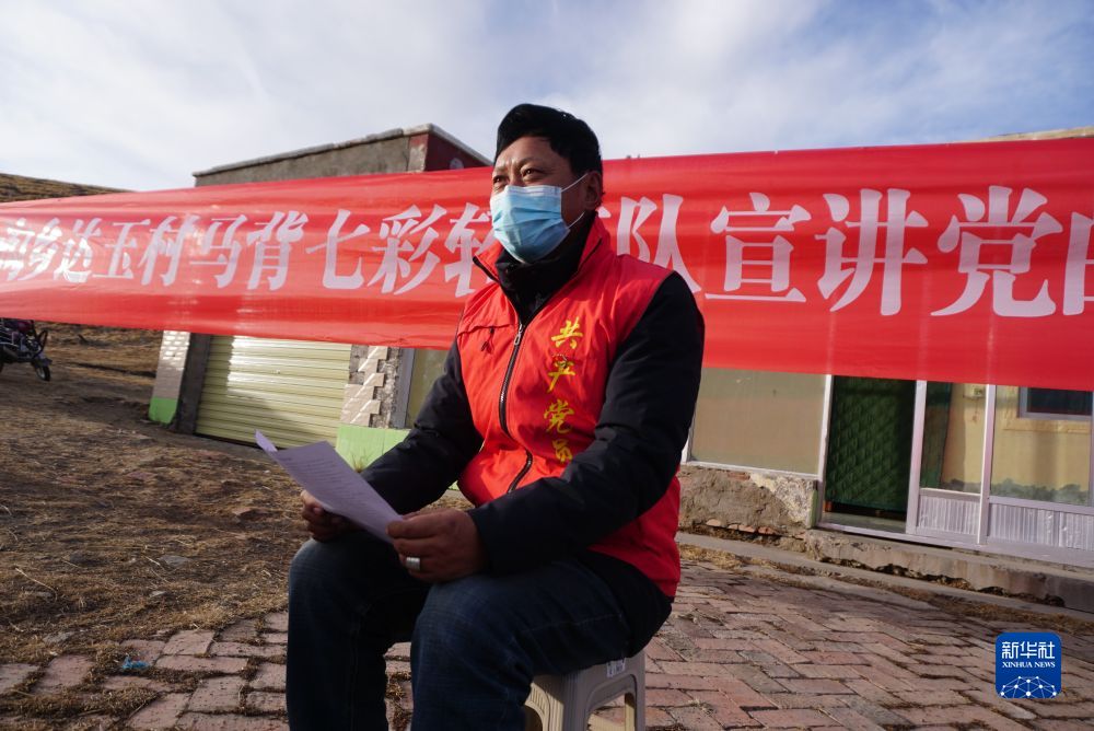 12月9日,才讓扎西在為牧民宣講黨的二十大精神。(新華社記者 周盛盛 攝)