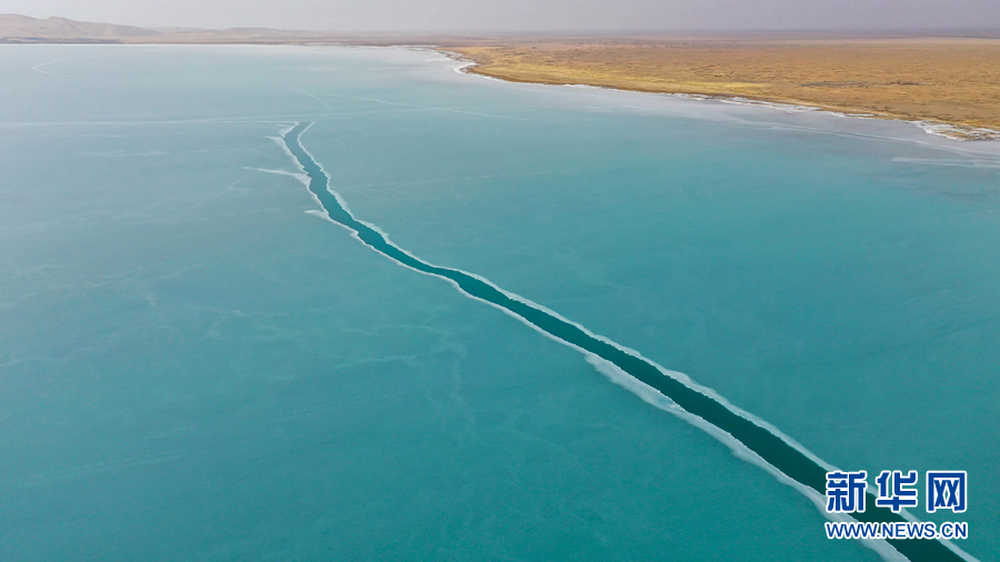 封凍的湖面如同破碎的“玉帶”,形成獨特的景觀。新華網 宋忠勇 攝