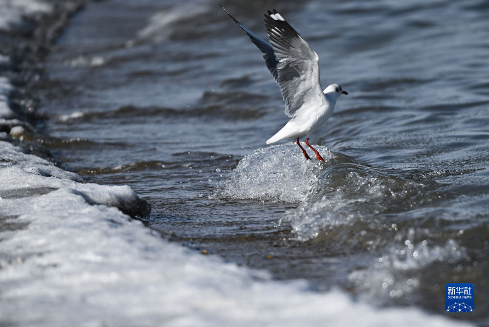 2022年12月9日,一只棕頭鷗在青海湖展翅。(新華社記者 張龍 攝)