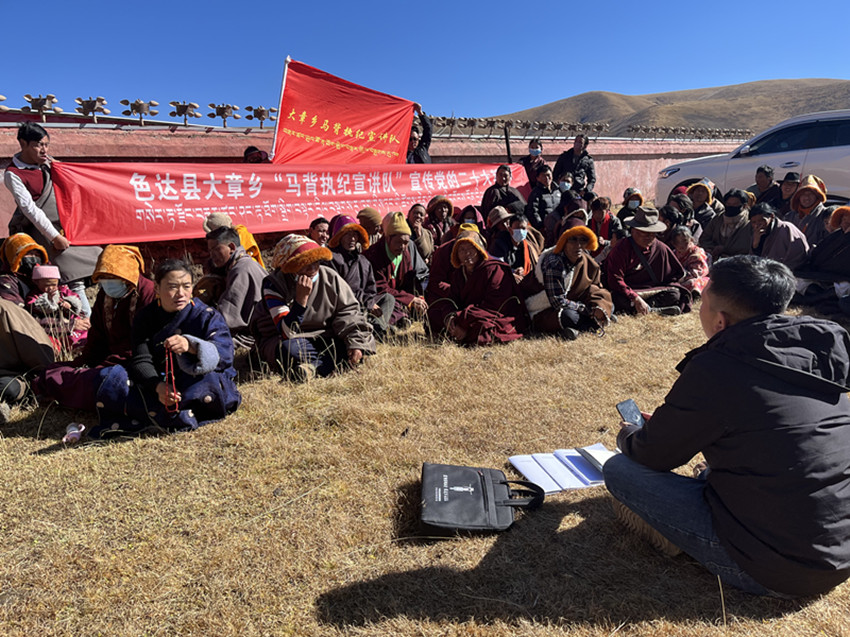 “針對色達(dá)高寒偏遠(yuǎn)、地廣人稀,牧區(qū)群眾生活居住較分散的情況,我們調(diào)配縣鄉(xiāng)村三級紀(jì)檢監(jiān)察力量,逐步組建起精通藏漢雙語、熟悉紀(jì)法知識、擅長群眾工作的馬背執(zhí)紀(jì)宣講隊(duì),把黨的聲音傳遞到云端藏寨、天邊牧場?!鄙_(dá)縣紀(jì)委書記、監(jiān)委主任陳玉龍介紹,黨的二十大以來,宣講隊(duì)已開展宣講活動20余場次,推動為群眾辦實(shí)事10余件,解決困難訴求20件。