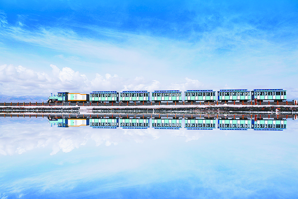地處柴達(dá)木盆地的茶卡鹽湖面積約百平方公里,鹽層平均厚度4米,最深處達(dá)13米,儲(chǔ)量約4.5億噸。因是固液并存的鹵水湖,天氣晴好時(shí),茶卡鹽湖湖面就像鏡子,堪比玻利維亞“天空之鏡”,故享有中國(guó)版“天空之鏡”美譽(yù)。