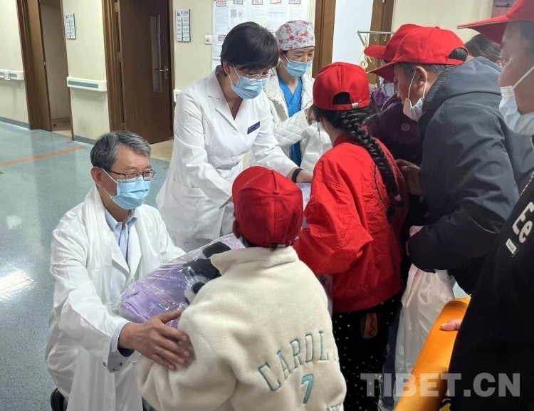圖為北醫(yī)三院心臟外科主任醫(yī)師、主任凌云鵬副教授(左一)等代表醫(yī)護(hù)人員向順利出院的3名來(lái)自青海省果洛藏族自治州的先心病患兒贈(zèng)送玩具、文具等 攝影:宮禧