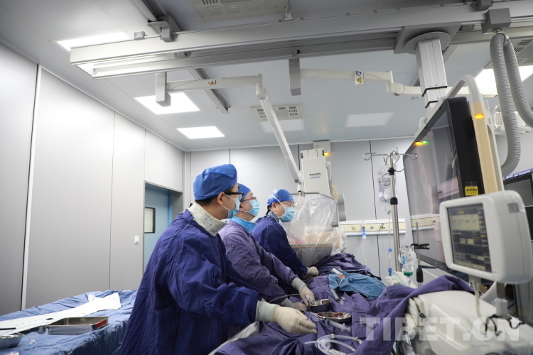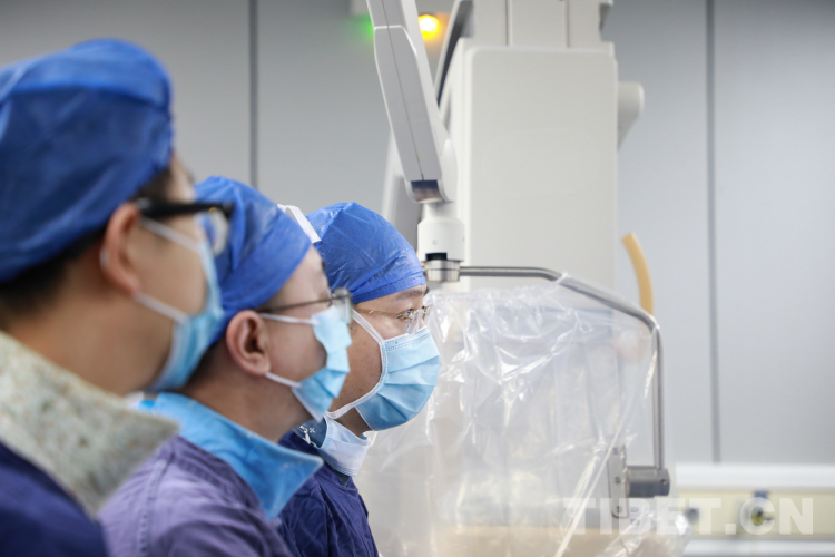 圖為北醫(yī)三院院長(zhǎng)助理唐熠達(dá)教授(右一)帶領(lǐng)專家團(tuán)隊(duì)在為來(lái)自青海省果洛藏族自治州的先心病患兒手術(shù)時(shí)觀察導(dǎo)管行進(jìn)情況 攝影:劉莉