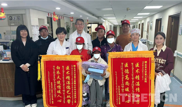 圖為3名來(lái)自青海省果洛藏族自治州的先心病患兒及患兒家屬等向北醫(yī)三院敬贈(zèng)錦旗 攝影:宮禧