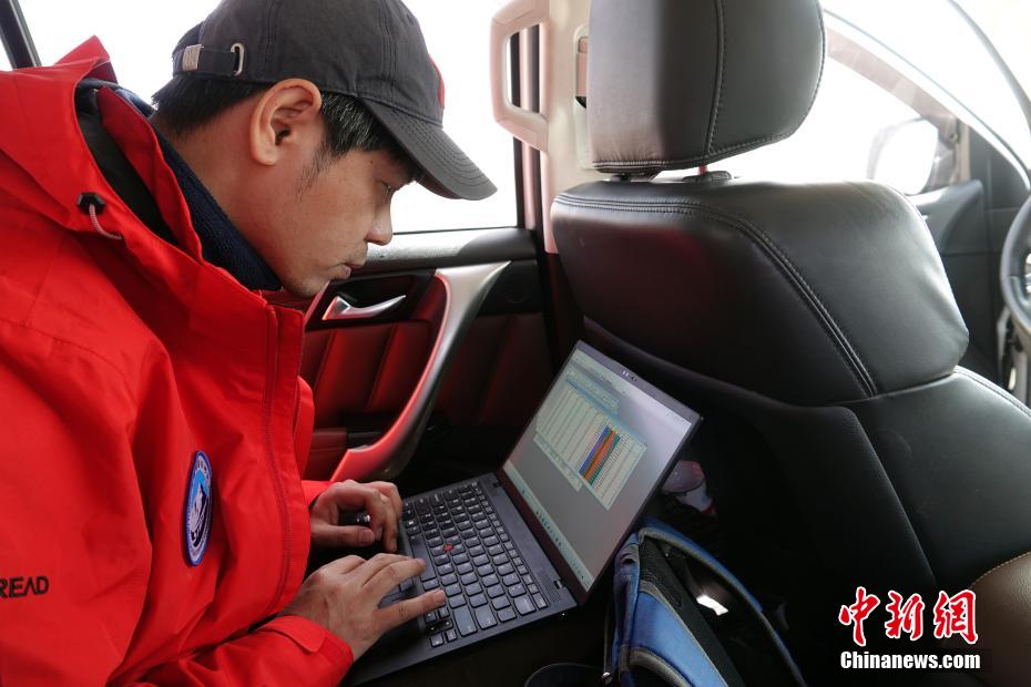 觀測站現(xiàn)場,第二次青藏科考隊員、中科院空天院鄭超磊副研究員隨即在車上進行數(shù)據(jù)初步檢查處理工作。中新社記者 孫自法 攝