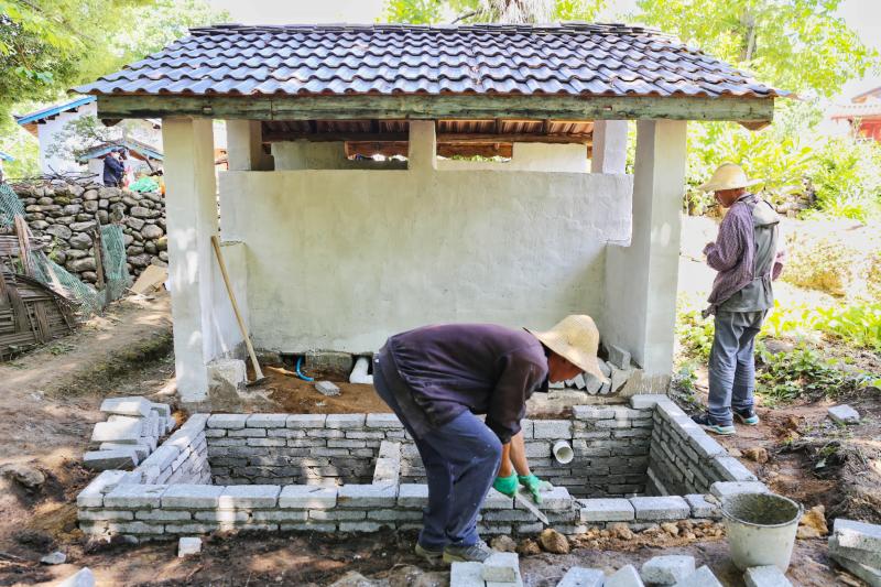 工人正在金江鎮(zhèn)吾竹村進(jìn)行農(nóng)村三格式戶(hù)廁建設(shè)