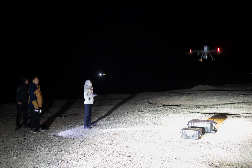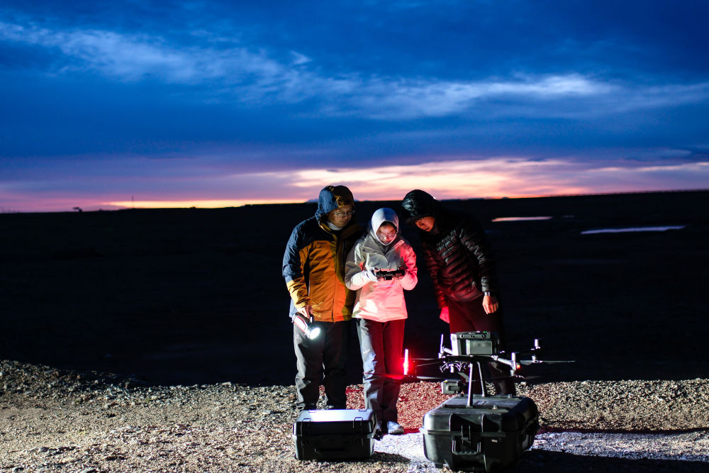 6月16日凌晨,連新明團(tuán)隊(duì)在青藏公路楚瑪爾河大橋附近,使用無人機(jī)監(jiān)測(cè)藏羚羊遷徙途中的夜宿地。