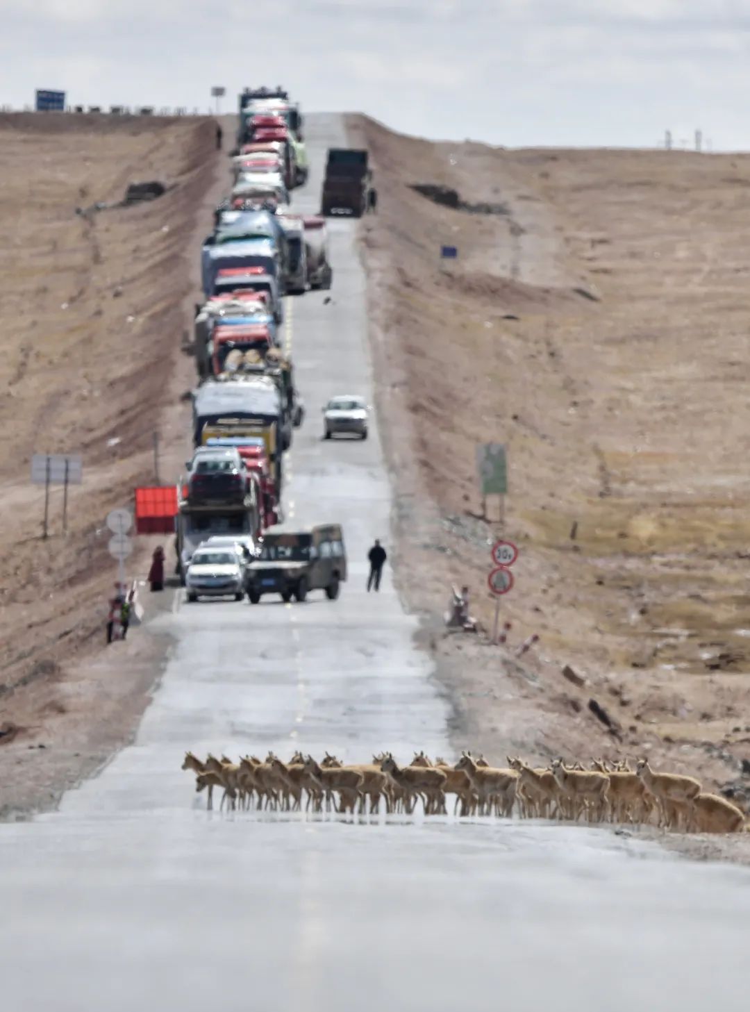 而在青藏公路這頭,可可西里管理處安排工作人員采取短暫交通管制、禁止鳴笛、巡護救助等措施,為藏羚羊遷徙產(chǎn)仔保駕護航。伴隨遷徙高峰期的到來,藏羚羊“過公路”已經(jīng)成為青藏公路沿線的一道獨特風景。