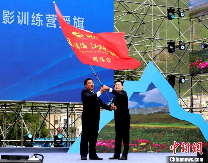 圖為中共玉樹州委副書記、宣傳部部長才旦周(左)為此次“大美青海 江源玉樹”攝影訓(xùn)練營授旗。薛蒂攝