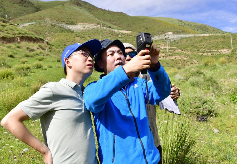 科考隊員任斐鵬(左二)和隊友一起用熱紅外儀觀測長江源區(qū)植被熱環(huán)境效應(yīng)。新華社記者 李勁峰 攝