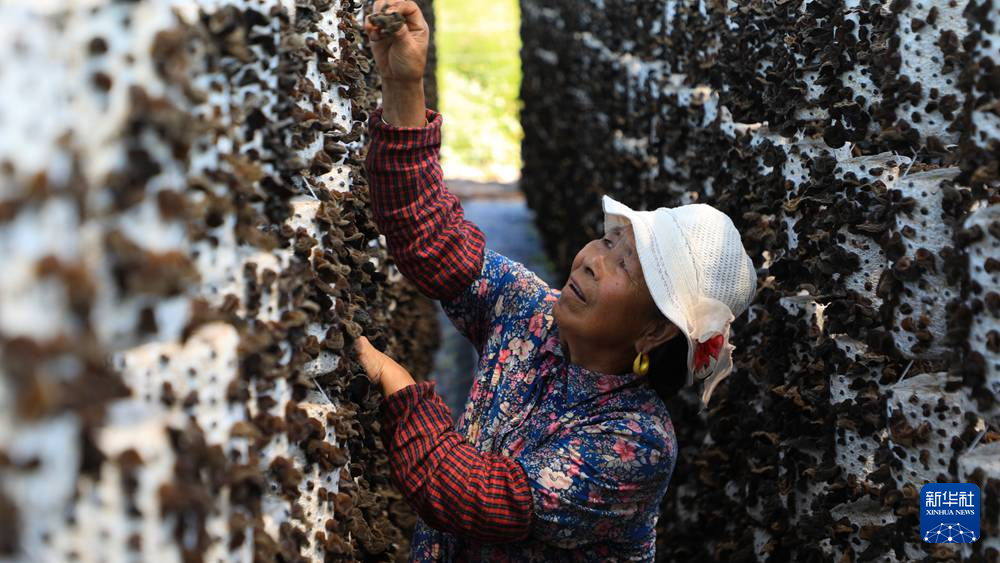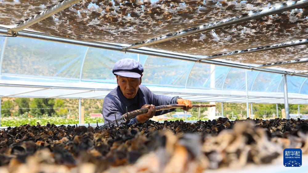7月29日,在卓尼縣納浪鎮(zhèn)納浪村黑木耳種植基地,農(nóng)戶在翻曬黑木耳。新華社記者 張智敏 攝