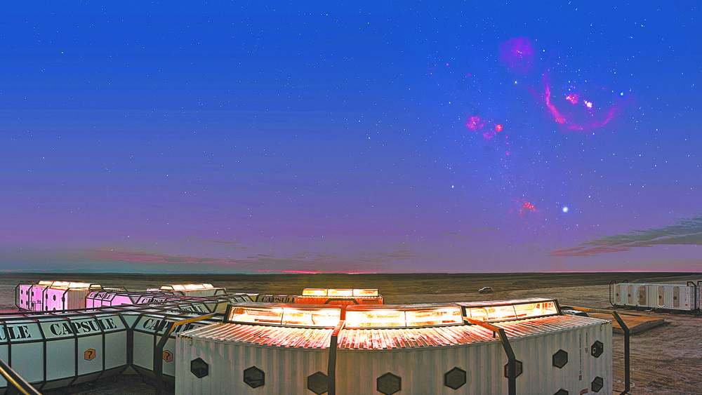 “我們的建筑風(fēng)格是模擬未來(lái)人類(lèi)移居火星后的生存環(huán)境,有‘總部大樓’‘火星艙’等?!表樦衩袷种傅姆较?,才發(fā)現(xiàn),原來(lái)那些白色集裝箱正是營(yíng)地建筑的主體。