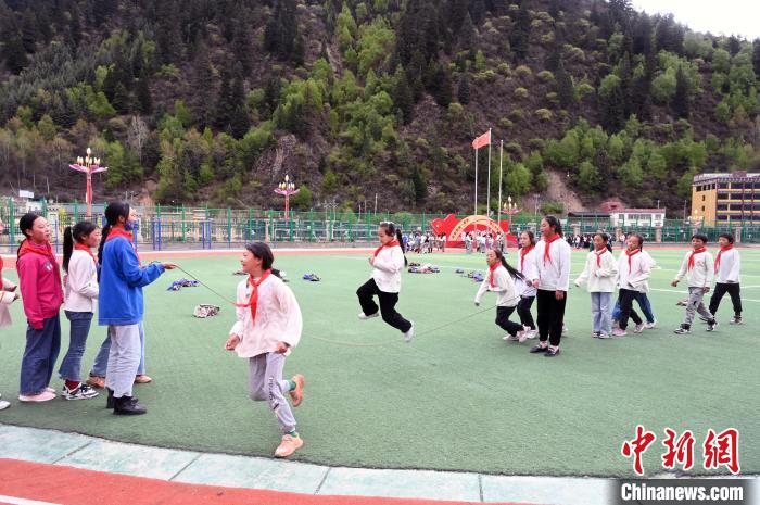 5月17日,四川阿壩州壤塘縣寄宿制學(xué)校的學(xué)生在操場(chǎng)跳繩。中新社記者 安源 攝