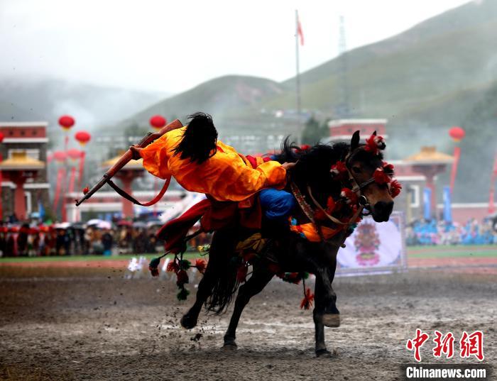 資料圖為玉樹州雜多縣瀾滄江源生態(tài)文化旅游系列活動開幕式上的馬術(shù)表演。薛蒂 攝