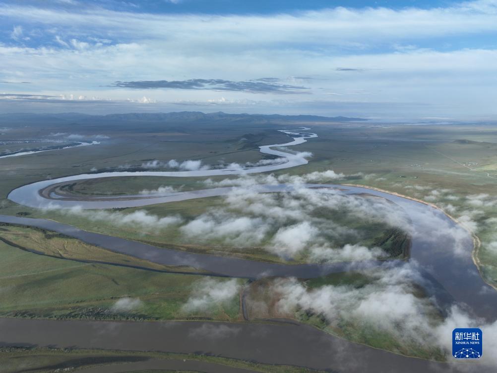 這是8月22日清晨在四川省阿壩藏族羌族自治州若爾蓋縣唐克鎮(zhèn)拍攝的黃河九曲第一灣景色(無人機照片)。新華社記者 邢廣利 攝