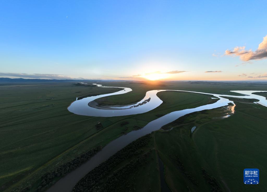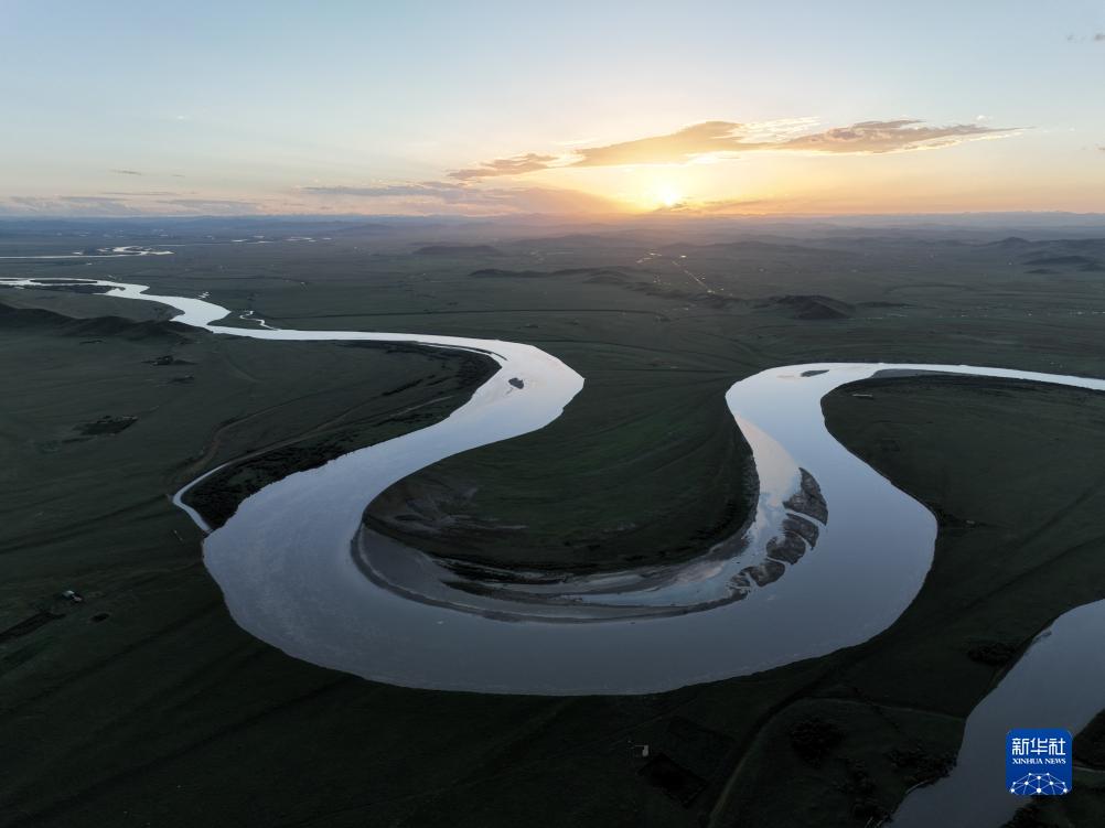 這是8月21日在四川省阿壩藏族羌族自治州若爾蓋縣唐克鎮(zhèn)拍攝的黃河九曲第一灣落日(無人機照片)。新華社記者 王曦 攝