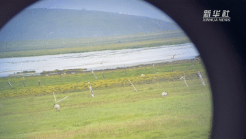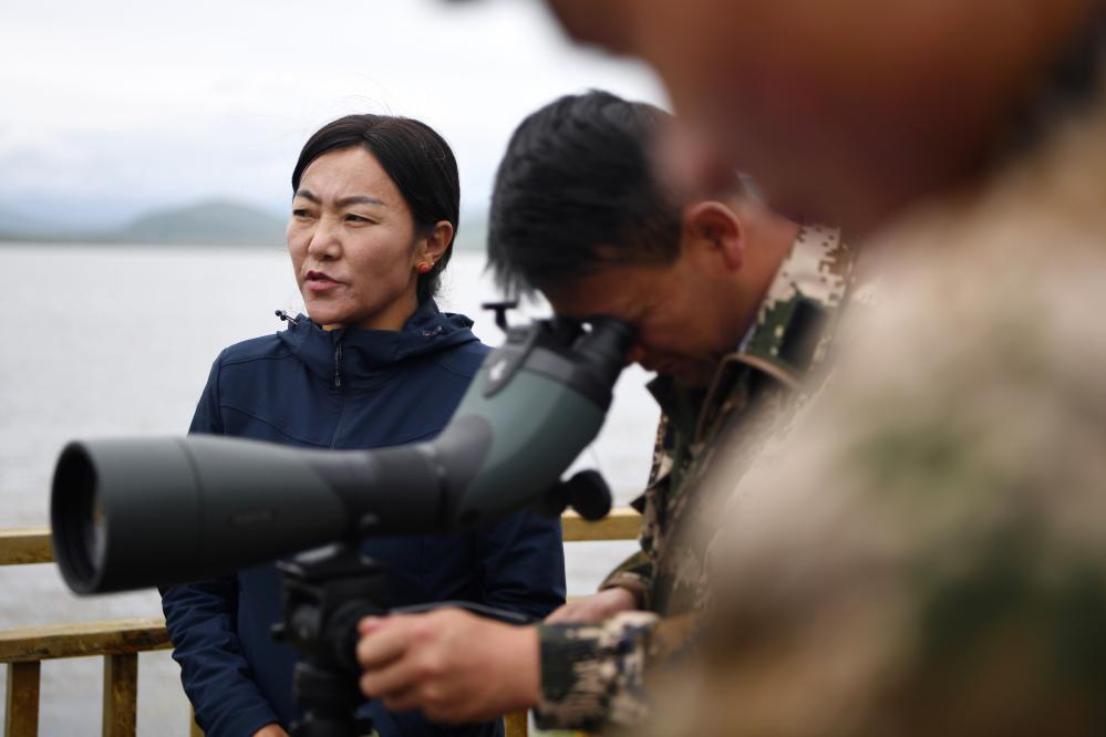 甘肅尕海則岔國(guó)家級(jí)自然保護(hù)區(qū)管護(hù)中心尕海保護(hù)站站長(zhǎng)香毛吉(左一)和同事在保護(hù)區(qū)內(nèi)用望遠(yuǎn)鏡觀測(cè)野生動(dòng)物。 新華社記者 陳斌 攝