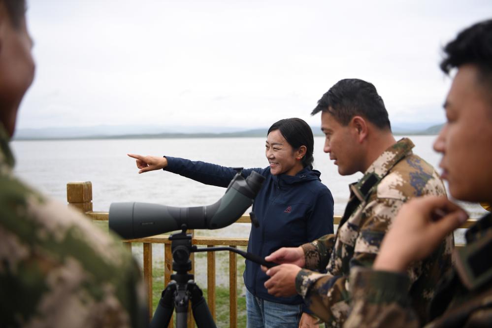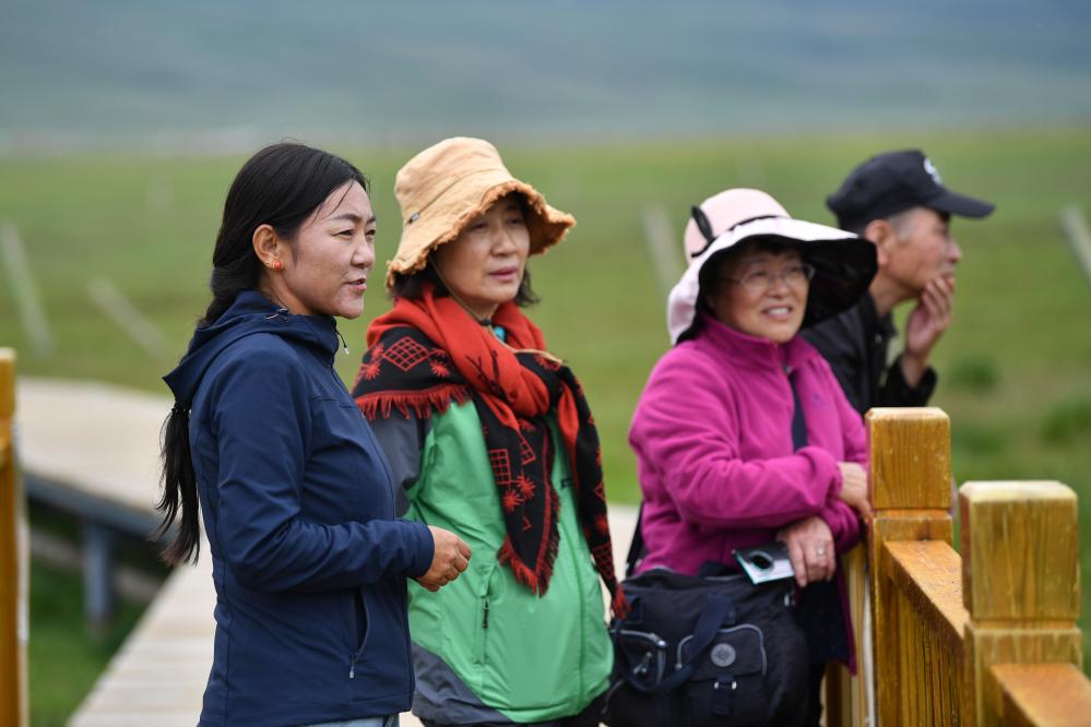 甘肅尕海則岔國(guó)家級(jí)自然保護(hù)區(qū)管護(hù)中心尕海保護(hù)站站長(zhǎng)香毛吉(左一)向游客介紹保護(hù)區(qū)的野生動(dòng)植物情況。 新華社記者 陳斌 攝