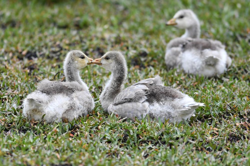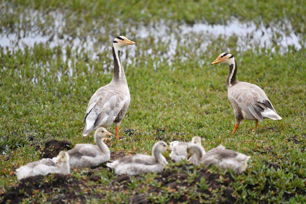 斑頭雁幼鳥(niǎo)在甘肅尕海則岔國(guó)家級(jí)自然保護(hù)區(qū)的尕海濕地嬉戲。 新華社記者 陳斌 攝