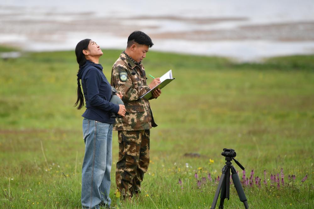 甘肅尕海則岔國(guó)家級(jí)自然保護(hù)區(qū)管護(hù)中心尕海保護(hù)站站長(zhǎng)香毛吉(左)和同事在巡護(hù)過(guò)程中做記錄。 新華社記者 方欣 攝