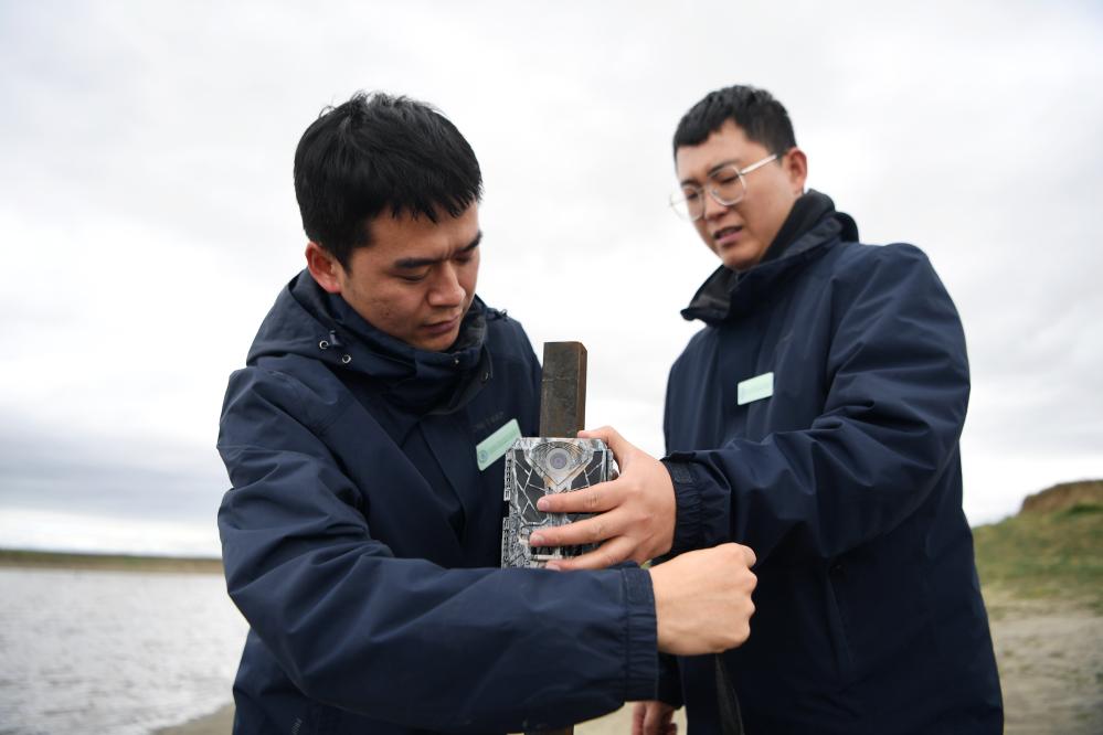 甘肅黃河首曲國(guó)家級(jí)自然保護(hù)區(qū)管護(hù)中心曼日瑪保護(hù)站工作人員王佳陽(yáng)(右)和同事在保護(hù)區(qū)內(nèi)安放紅外相機(jī)。 新華社記者 張可任 攝