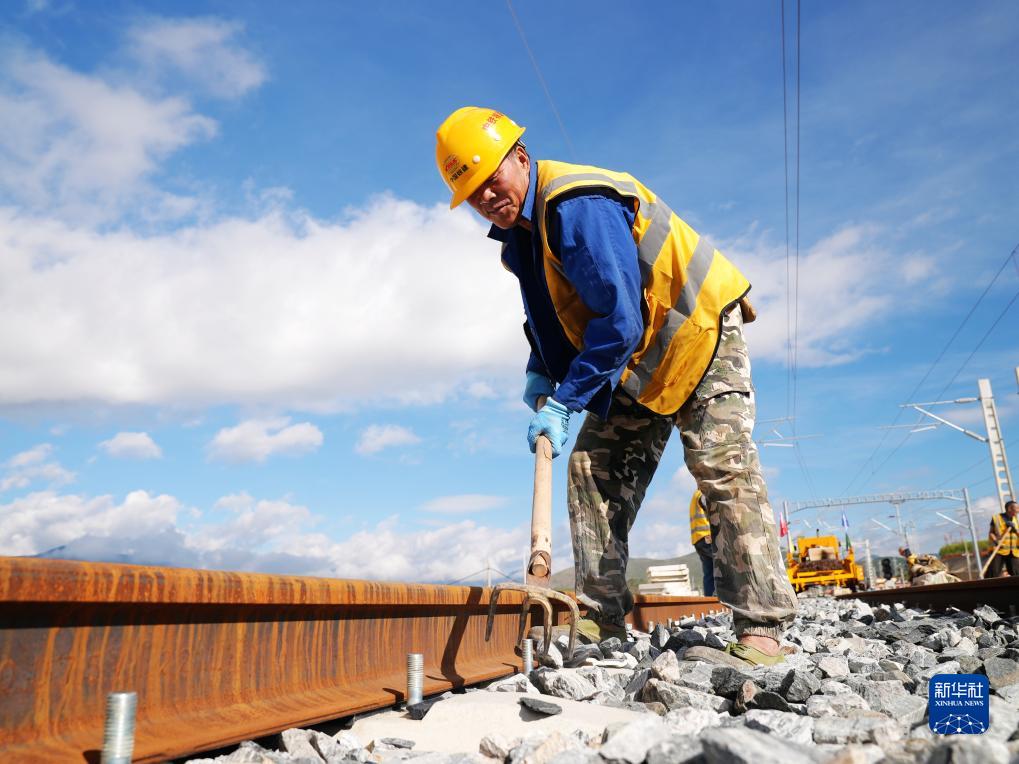9月18日,施工人員在滇藏鐵路麗香段香格里拉站清理道床。新華社 周濤 攝