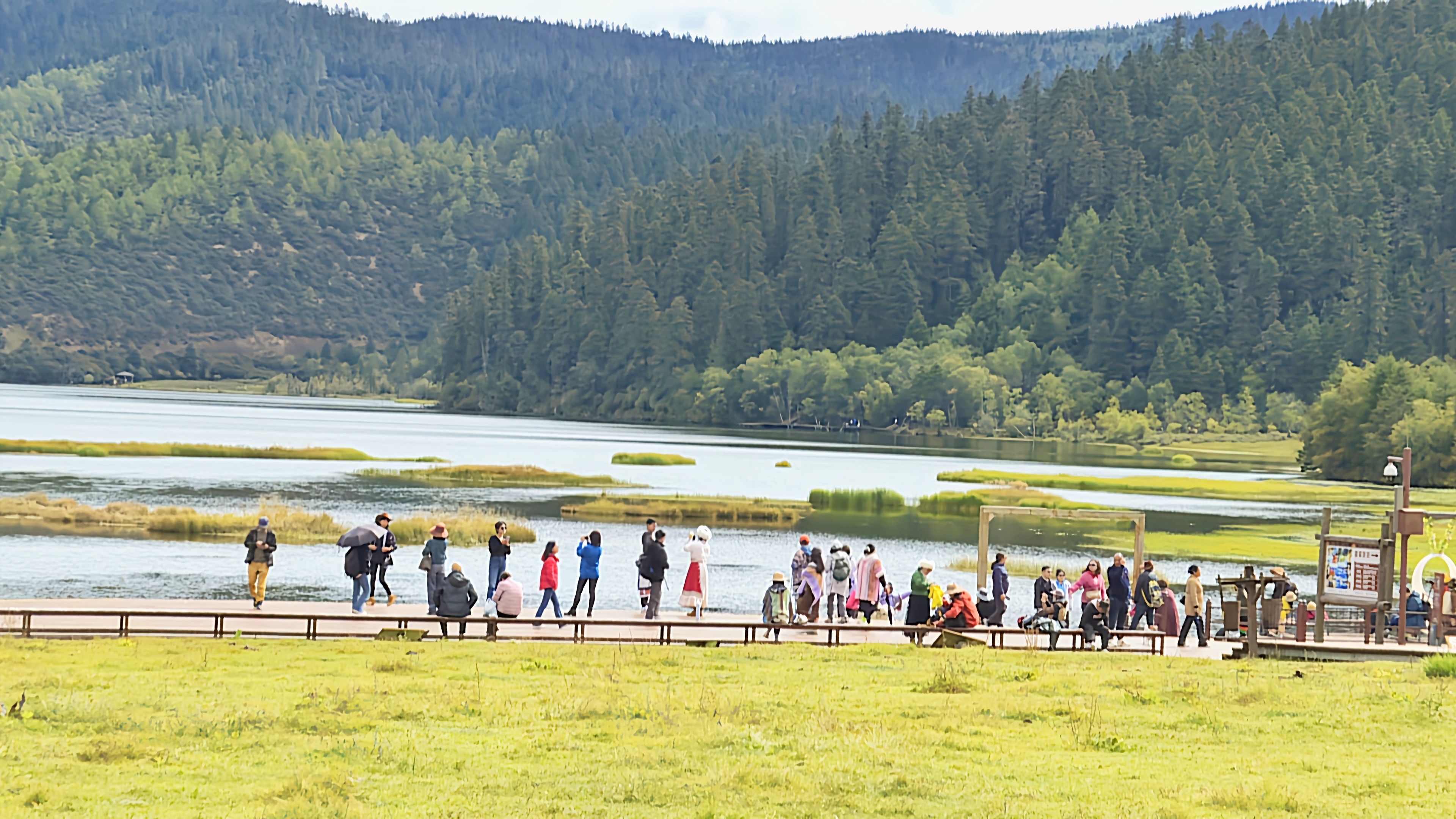 秋日的普達(dá)措國家公園層林盡染、色彩斑斕,高山草甸、原始森林與湖泊濕地構(gòu)成了一幅幅美麗的畫卷,屬都湖棧道上人群熙熙攘攘?!拔沂堑谝淮蝸硐愀窭锢糜?,香格里拉給我的感覺就是,這里的生態(tài)環(huán)境保護(hù)得很好,綠水青山,很值得來游玩。”游客宋女士表示。