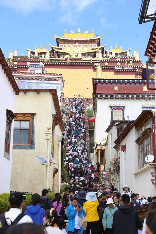 擁有著“小布達(dá)拉宮”和“藏族藝術(shù)博物館”之稱的噶丹·松贊林寺人氣高漲,不少游客身著藏民族服飾欣喜地在景區(qū)寺院的金頂、黃墻下合影留念。景區(qū)外車水馬龍,停車場及公路沿線兩側(cè)停滿了來自全國各地的自駕游車輛,交警及景區(qū)工作人員井然有序的指揮著交通。景區(qū)內(nèi),游客源源不斷,在上車點(diǎn)排起了長隊(duì),工作人員忙碌地指引著游客按秩序檢票上車,“人實(shí)在太多了,假期以來從早上7點(diǎn)至晚上7點(diǎn)半都有游客進(jìn)出,19輛擺渡車都在不停運(yùn)行?!币晃痪皡^(qū)工作人員告訴記者。