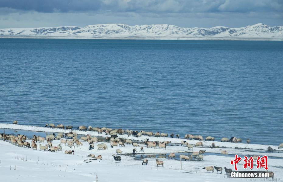 降雪過后,羊群在青海湖邊飲水、覓食。馬銘言 攝