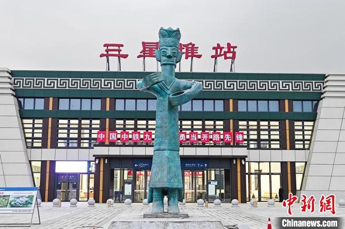 三星堆站位于德陽(yáng)廣漢市南興鎮(zhèn)與向陽(yáng)鎮(zhèn)交界處,距廣漢市區(qū)約5公里,距三星堆遺址約5公里,站場(chǎng)規(guī)模為2臺(tái)4線。車站廣場(chǎng)上,豎立著一尊青銅立人像,站房外立面將三星堆出土的青銅人面具抽象為車站整體造型,局部點(diǎn)綴回字紋雕花的仿古元素。同時(shí),裝飾裝修深化設(shè)計(jì)中將外立面檐口褐色調(diào)整為青銅色,彰顯了三星堆深遠(yuǎn)的人文背景?!败囌菊痉恳匀嵌殉鐾恋那嚆~人面具造型為靈感?!敝需F九局成蘭站房項(xiàng)目部總工程師楊禮銘表示,施工過(guò)程中對(duì)鋁板內(nèi)部龍骨布置及鋁板分格進(jìn)行了數(shù)次優(yōu)化,順利完成站房裝飾裝修工程,投用后將成為當(dāng)?shù)匾坏貥?biāo)性建筑。