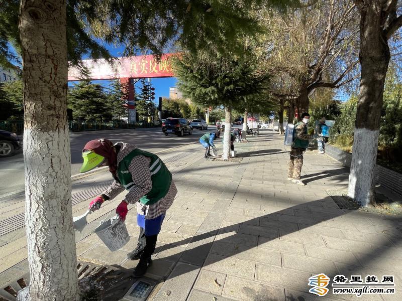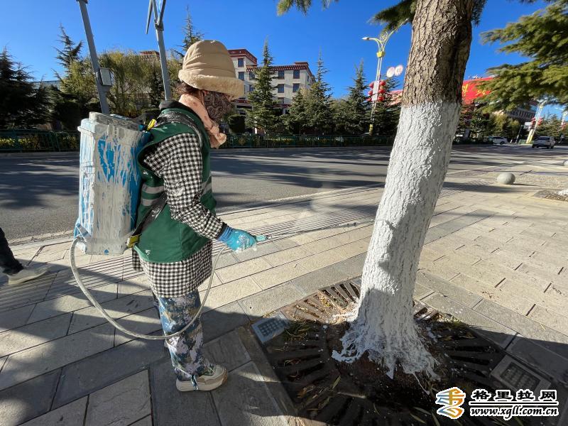 入冬以來,為保障樹木“安全健康”過冬,香格里拉市有關部門在城區(qū)主次干道、公園、廣場對樹木進行涂白,這是入冬后樹木養(yǎng)護管理的一項措施,可以有效防止樹木遭受蟲害和凍害。圖為綠化工人一手提漆桶、一手拿刷子,在康珠大道將綠化樹主干逐一涂白。( 此里只瑪攝)