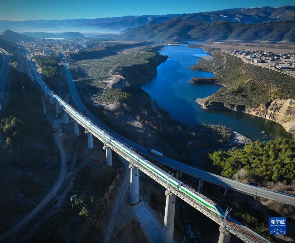 11月26日,列車行駛在麗香鐵路線上(無人機(jī)照片)。新華社記者 邢廣利 攝