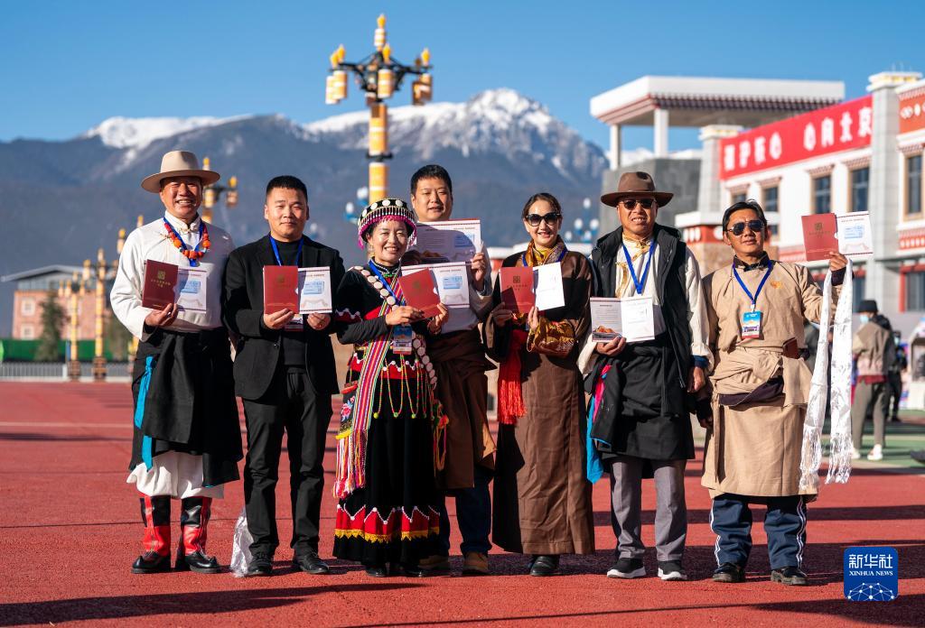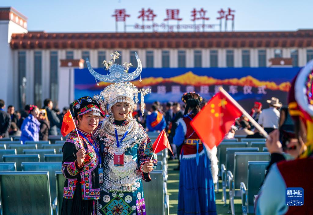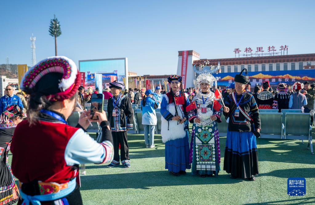 11月26日,參加麗香鐵路開通儀式的少數(shù)民族代表在開通儀式上拍照留念。新華社記者 陳欣波 攝