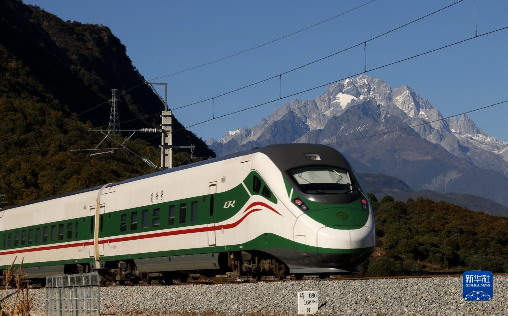 11月26日,列車從玉龍雪山腳下駛過。新華社記者 胡超 攝