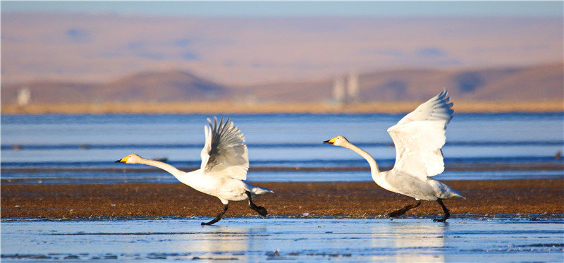 冬日的青海湖,一碧千里沒有雜色。湖面像一層薄薄的透明玻璃,晶瑩剔透,湖岸周圍是金黃的草場,遠(yuǎn)處是高聳入云的雪峰,潔白的天鵝恰似水中仙子,伸展雙翼,引翅拍水,蕩漾著水波,構(gòu)成一幅冬日美景圖。[詳細(xì)] -
